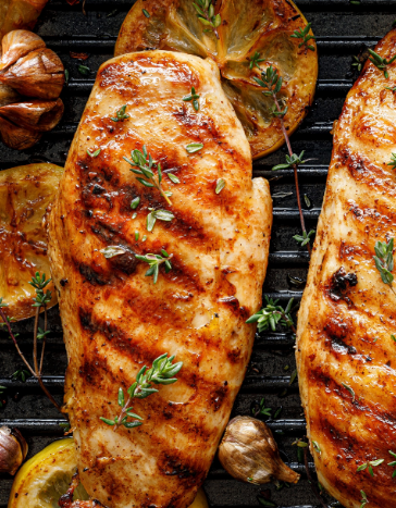 Özel sos ile marine edilmiş ızgara tavuk, patates kızartması, mix salata, özel sos ile