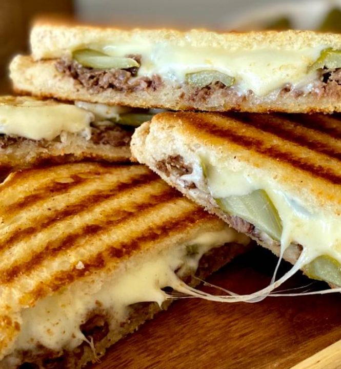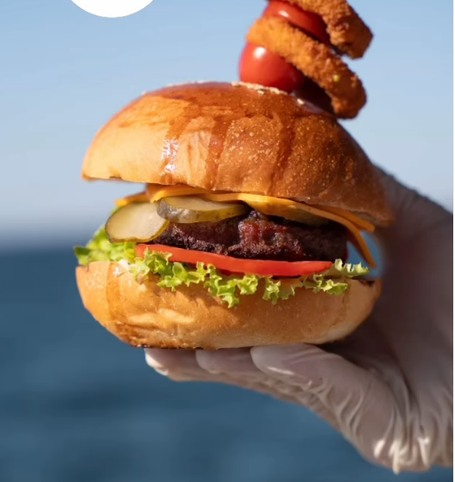 Dana eti, mor soğan, cheddar peyniri, özel sos ve siyah ekmek ile