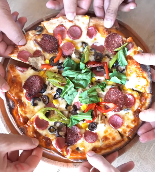 Mozarella peyniri, kasap sucuk, sosis, mantar, biber, mısır, siyah zeytin, pizza sosu