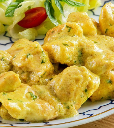 Panelenmiş tavuk topu, mantar,köri sos, renkli biberler, patates kızartması, mix salata