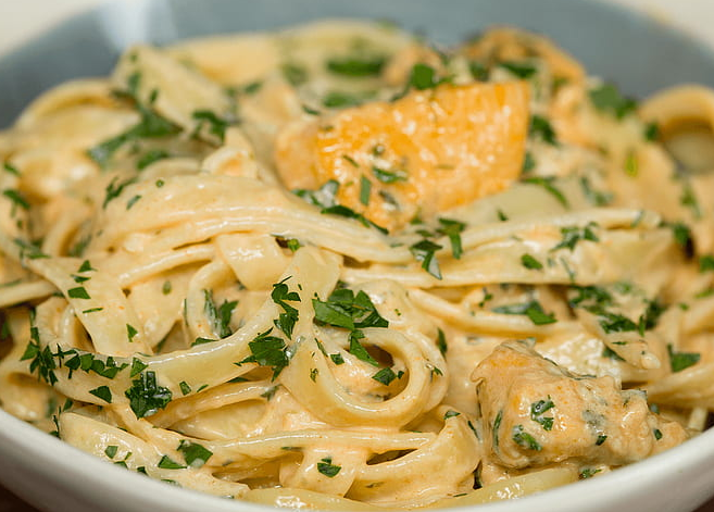 Jülyen doğranmış tavuk parçaları, krema, mantar, parmesan peyniri, pesto sos
